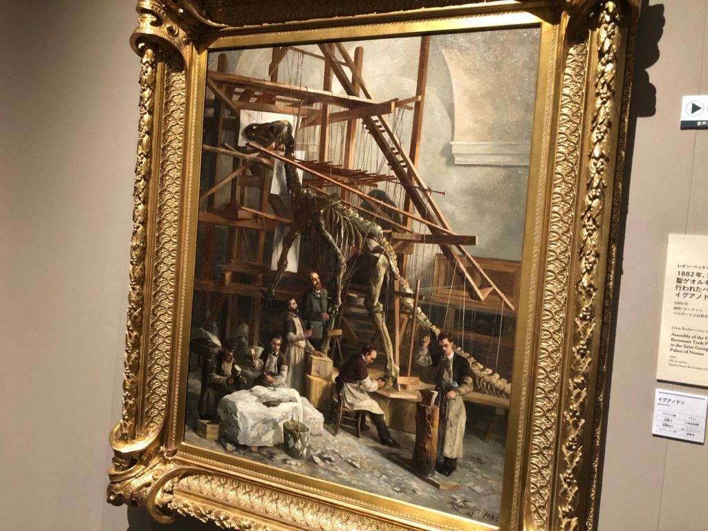 イグアノドンの化石を組み立てている様子を描いた絵画です。